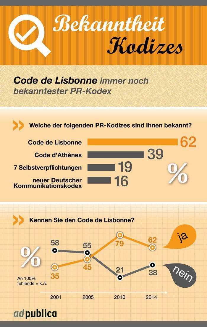 Hamburg, 8. Oktober 2014. Kennen PR-Fachleute die Verhaltensregeln ihres Berufsstandes und halten sie sich daran? Zwingt der wirtschaftliche Druck gerade Agenturen dazu, ethisch-moralische Richtlinien zu missachten? Weichen die oft unausgesprochenen Regeln in der Zusammenarbeit zwischen Journalisten und PR-Leuten dem neuen Wilden Westen der Social Media? Und wie verhalten sich PR-Profis wenn es um Blogger Relations geht? Diese und andere Fragen stellte ad publica knapp 1.000 Verantwortlichen für Öffentlichkeitsarbeit in Agenturen und Unternehmen unterschiedlicher Branchen und Größen im Rahmen einer Umfrage zum Ehrenkodex „Code de Lisbonne“. Zu den zentralen Erkenntnissen aus den Antworten der befragten PR-Profis (8,3 Prozent Rücklaufquote) zählen unter anderem die deutliche Bekanntheit des in die Jahre gekommenen Code de Lisbonne gegenüber z. B. dem aktuelleren neuen Deutschen Kommunikationskodexes sowie die von jedem Fünften unterstellte Käuflichkeit von Bloggern. Nach 2001, 2005 und 2010 ist dies die vierte Umfrage zum Thema, die die Hamburger Agentur für Öffentlichkeitsarbeit ad publica durchführt.